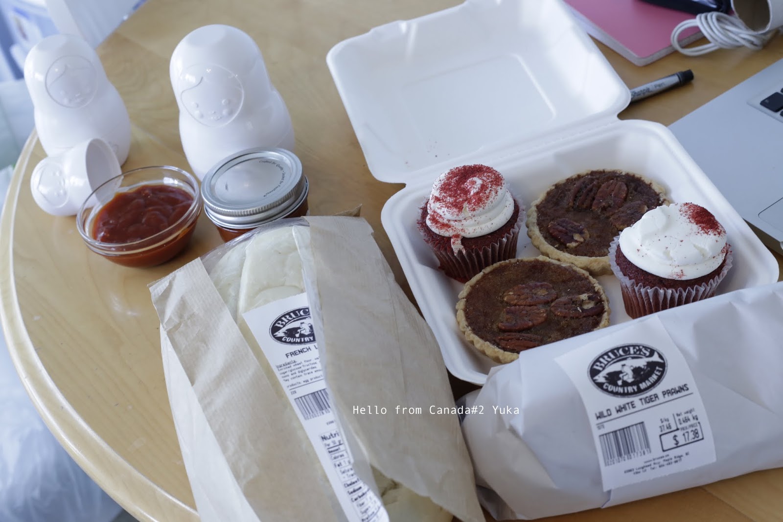 そしたら、おいしそうなパンと、エビと、デザートを買ってきてくれたよ。