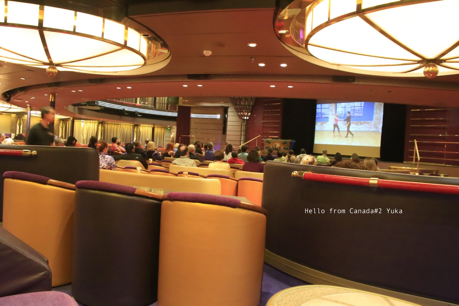 船の中では、絶えず、毎日毎日毎日、何かしらイベントがあっていて、まあ、飽きませんわよ。ナントカ教室(フラワーアレンジメント、写真、コンピューター、タオルで作る動物教室、ゴールドラッシュ時代の歴史教室、ダンス各種、などなど)とか、ゲーム、ビンゴ、ポーカー大会、カラオケ大会、ビール、ワイン、スコッチテイスティング、カクテル講座、映画も毎日違うのやってるし、もういろいろで、むしろそれに参加しまくりで忙しい!とかいう人もいるし。